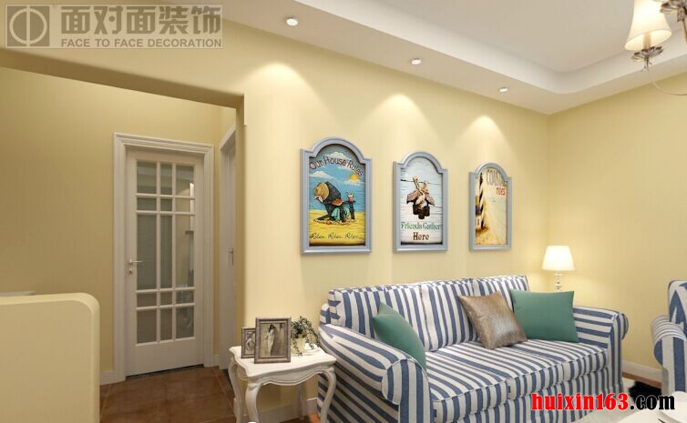 本套房屋的墙壁以杏色为主,不仅可以带给我们一种舒适的感觉,在整体的色调搭配上也可以搭配出一种干净明亮的效果,沙发背景墙上使用了三幅装饰画来装点,具有小窗造型的画框比较具有地中海特色,蓝白相间的条纹布艺沙发更是将清新家居展现的淋漓尽致,电视背景墙上粘贴了具有仿古色彩的壁纸做装饰,可以带给人们一种怀旧的感觉,电视上方则使用了装饰木板打出了一个格架,格架上方可以摆放书籍也可以摆放一些具有特色的装饰品,不仅可以使客厅中充满书香还可以为客厅增添一丝设计感。